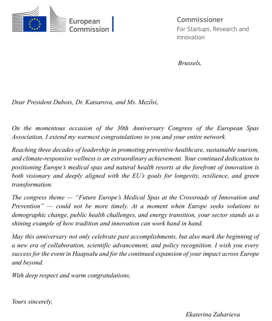 “Reaching three decades of leadership in promoting preventive healthcare, sustainable tourism, and climate-responsive wellness is an extraordinary achievement. Your continued dedication to positioning Europe’s medical spas and natural health resorts at the forefront of innovation is both visionary and deeply aligned with the EU’s goals for longevity, resilience, and green transformation.”